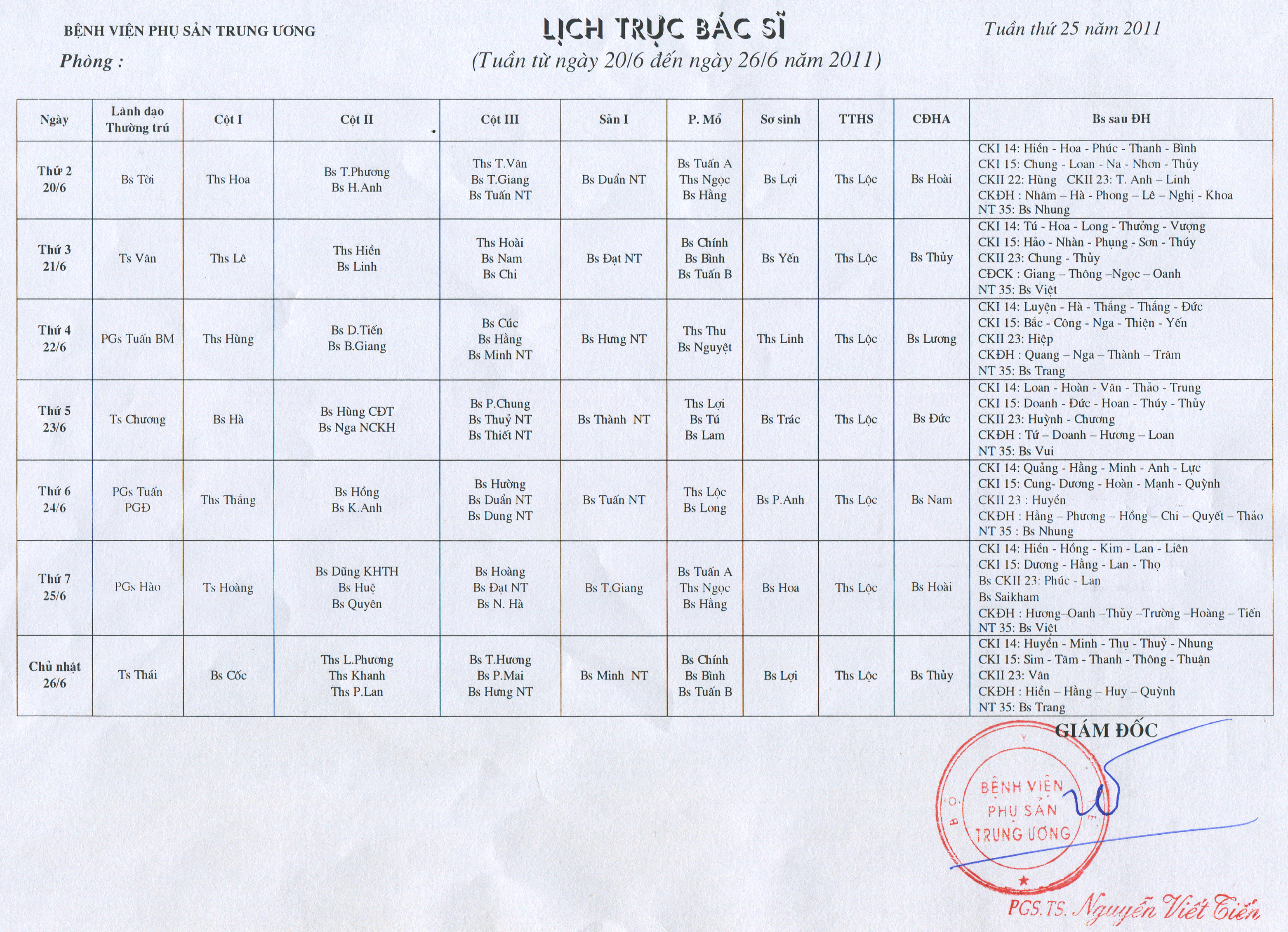 Lịch công tác tuần 25 năm 2011 | BVPSTW | 30-05-2011 | 30-05-2011 |