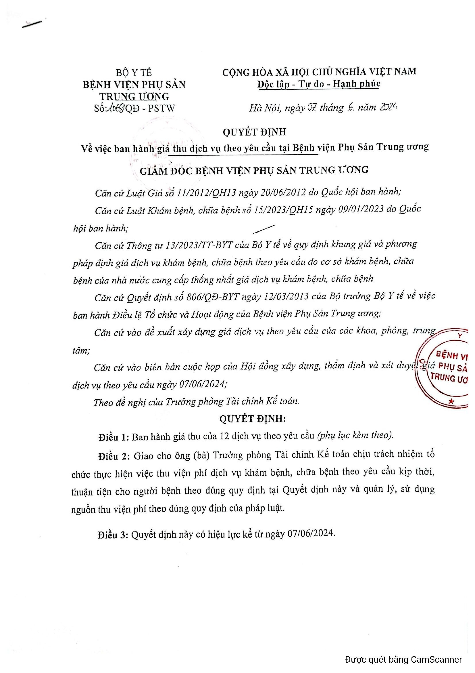Về việc ban hành giá thu dịch vụ theo yêu cầu tại Bệnh viện Phụ sản Trung ương