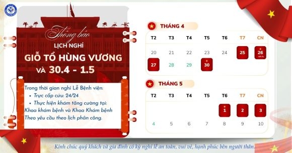 Lịch nghỉ lễ Giỗ Tổ Hùng Vương và 30/4-1/5 năm 2026 tại Bệnh viện Phụ SẨN Trung ương chính thức như sau: