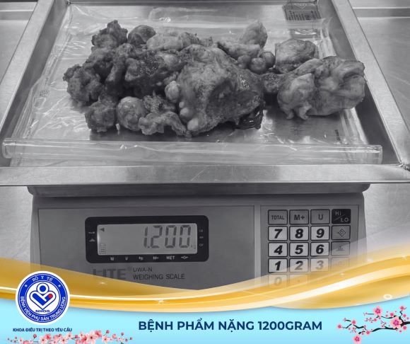 Trước đó, bệnh nhân đến khám trong tình trạng bụng to dần, rất dễ nhầm lẫn với tình trạng tăng cân ở tuổi trung niên. Qua thăm khám lâm sàng kết hợp với chẩn đoán hình ảnh, các bác sĩ đã xác định tử cung có nhiều khối u xơ kích thước lớn, phát triển chiếm gần như toàn bộ ổ bụng.