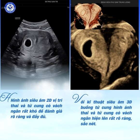 Hình ảnh siêu âm 2D vị trí thai và tử cung có vách ngăn rất khó để đánh giá rõ ràng và đầy đủ, tuy nhiên với kĩ thuật siêu âm 3D buồng tử cung hình ảnh thai và tử cung có vách ngăn hiện lên rất rõ ràng, sắc nét