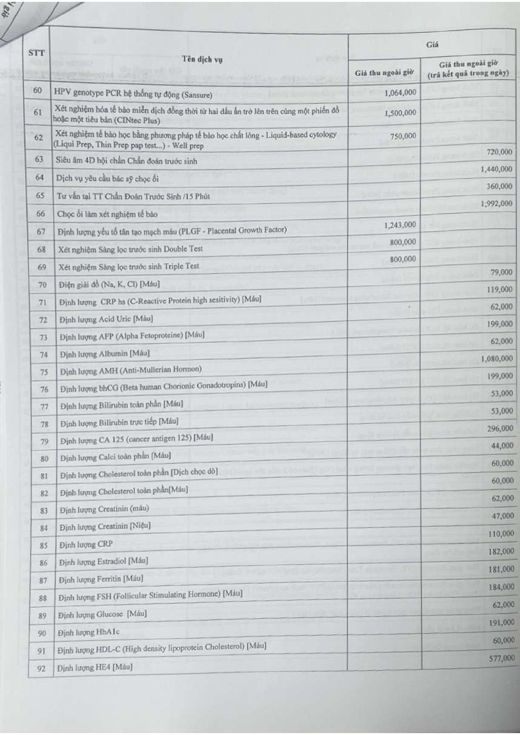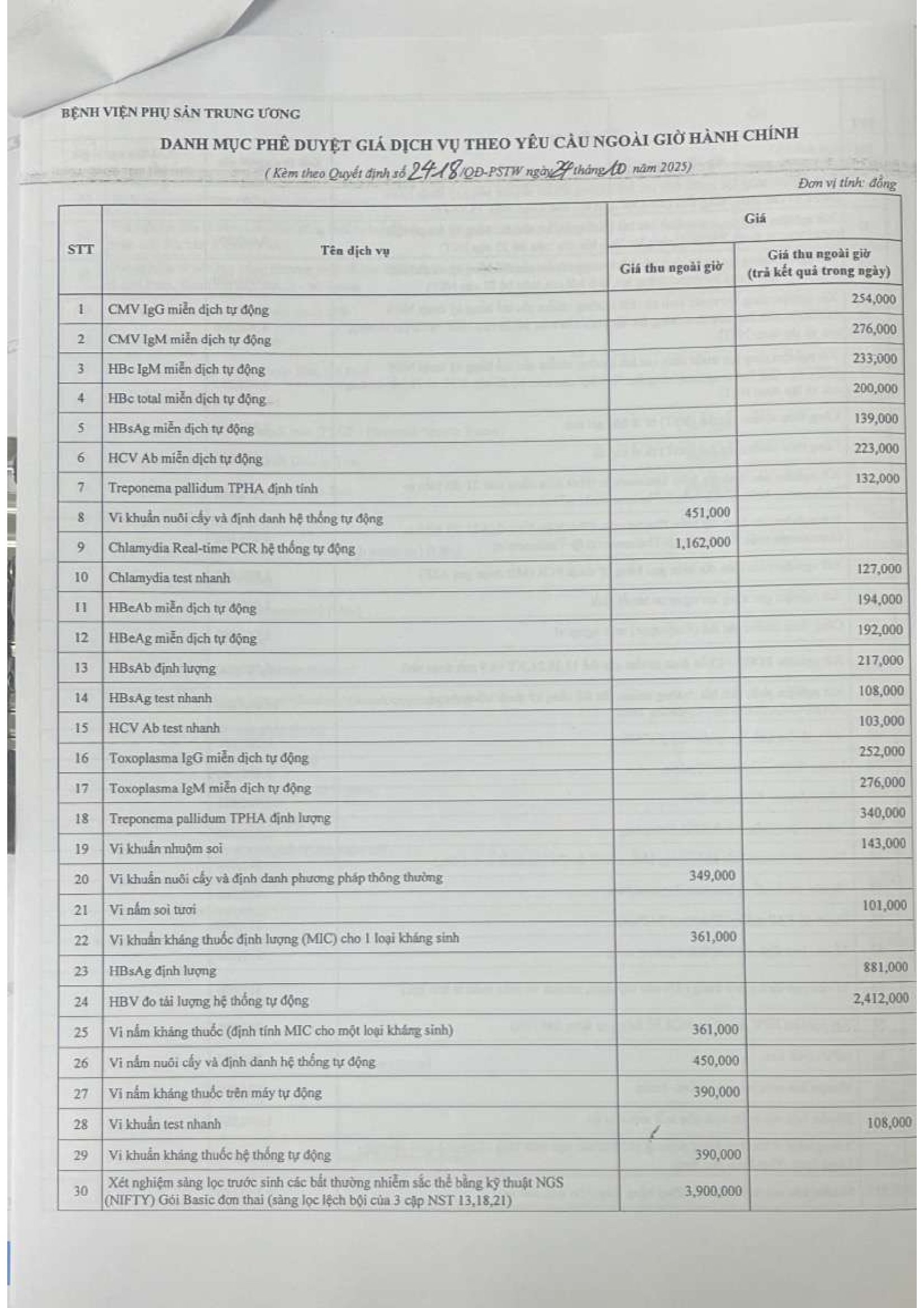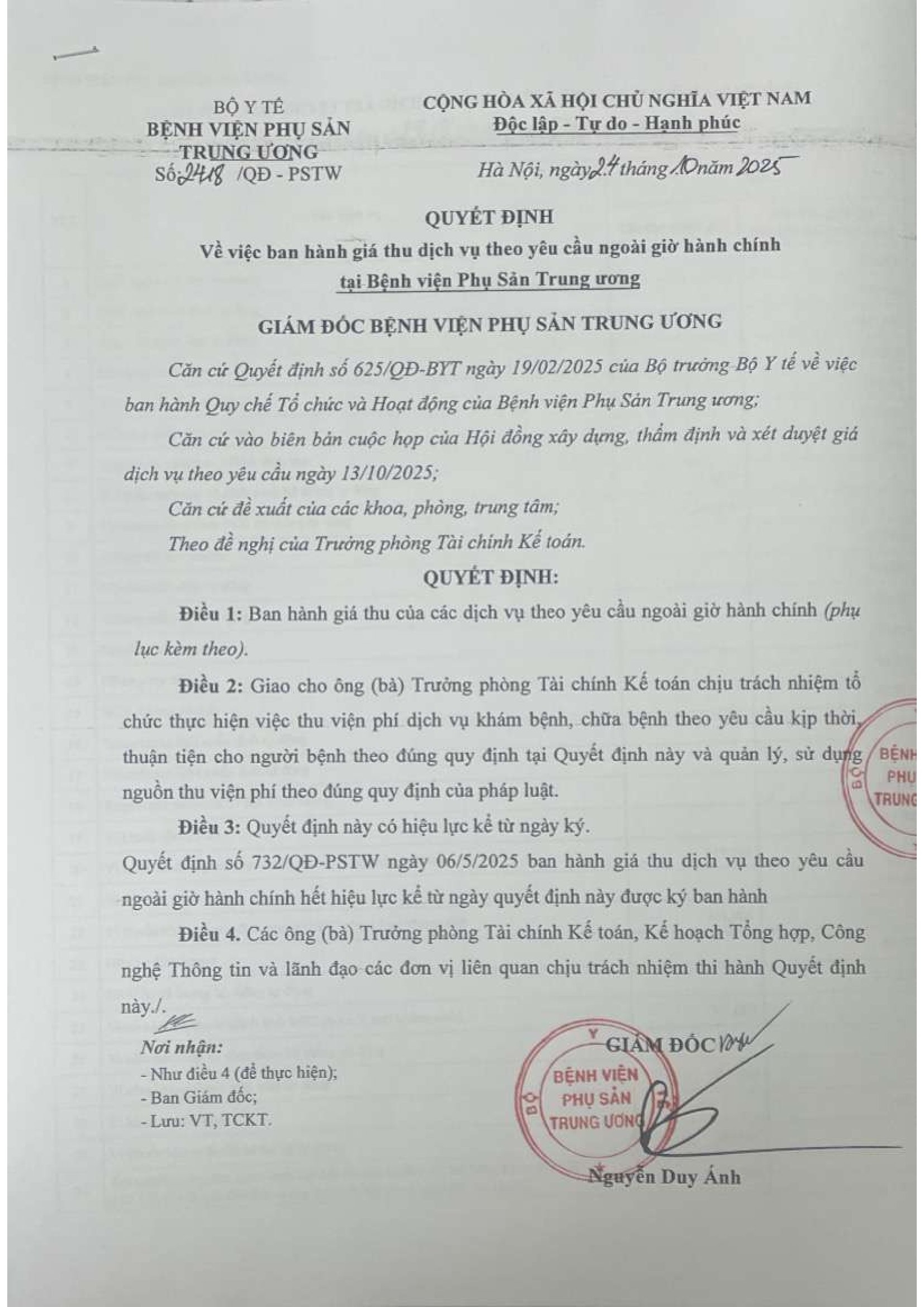 Các quyết định ban hành giá thu dịch vụ theo yêu cầu tại Bênh viện Phụ sản Trung ương