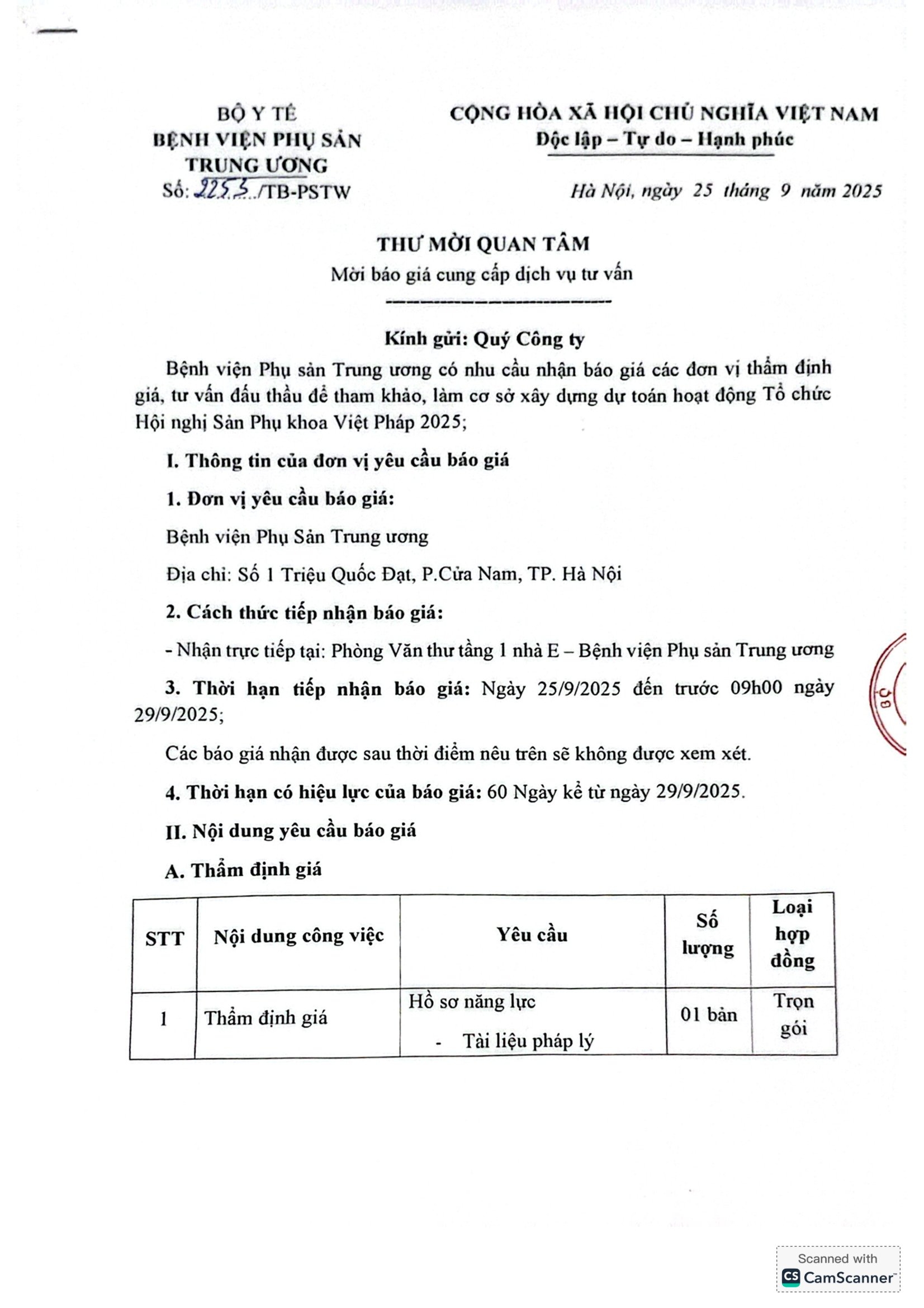 Thư mời báo giá số 2253/TB-PSTW ngày 25/9/2025