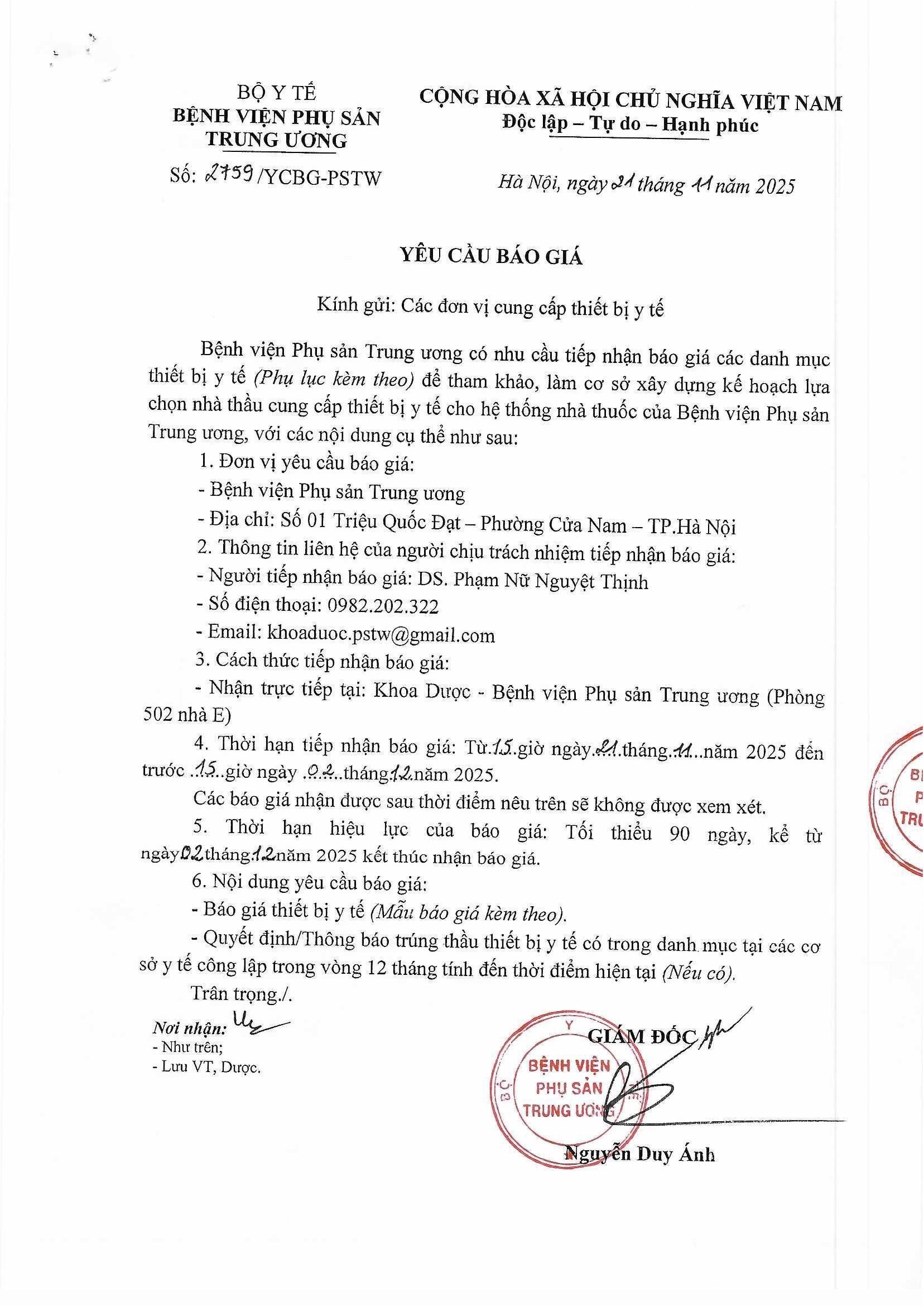 Yêu cầu báo giá số 2759/YCBG-PSTW ngày 21/11/2025