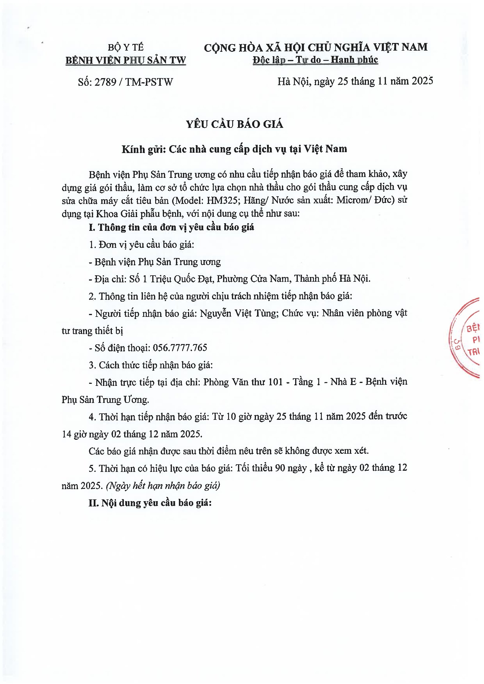 Yêu cầu báo giá số 2789/YCBG-PSTW ngày 25/11/2025
