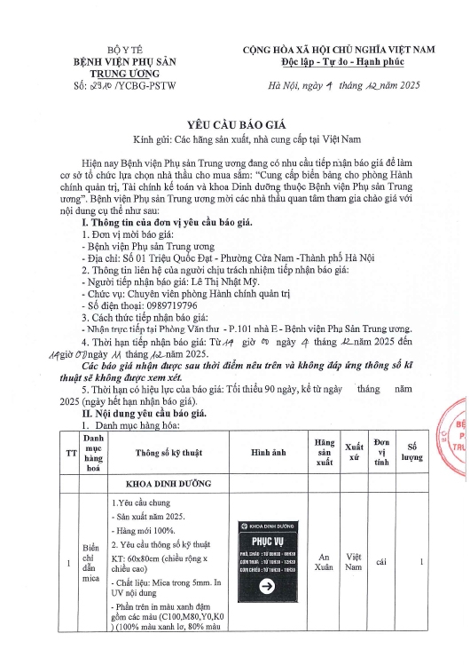 Yêu cầu báo giá số 2855/YCBG-PSTW ngày 01/12/2025
