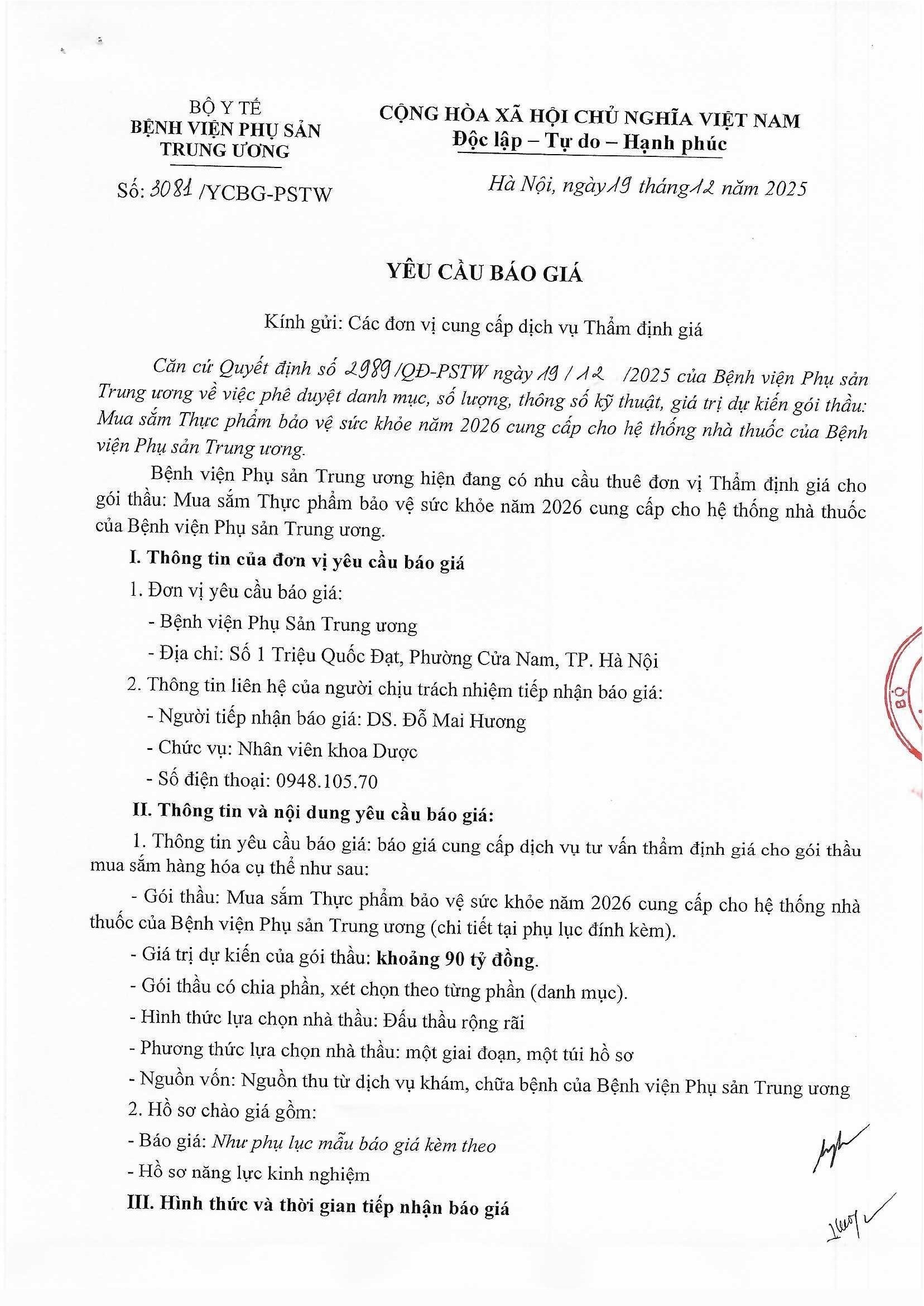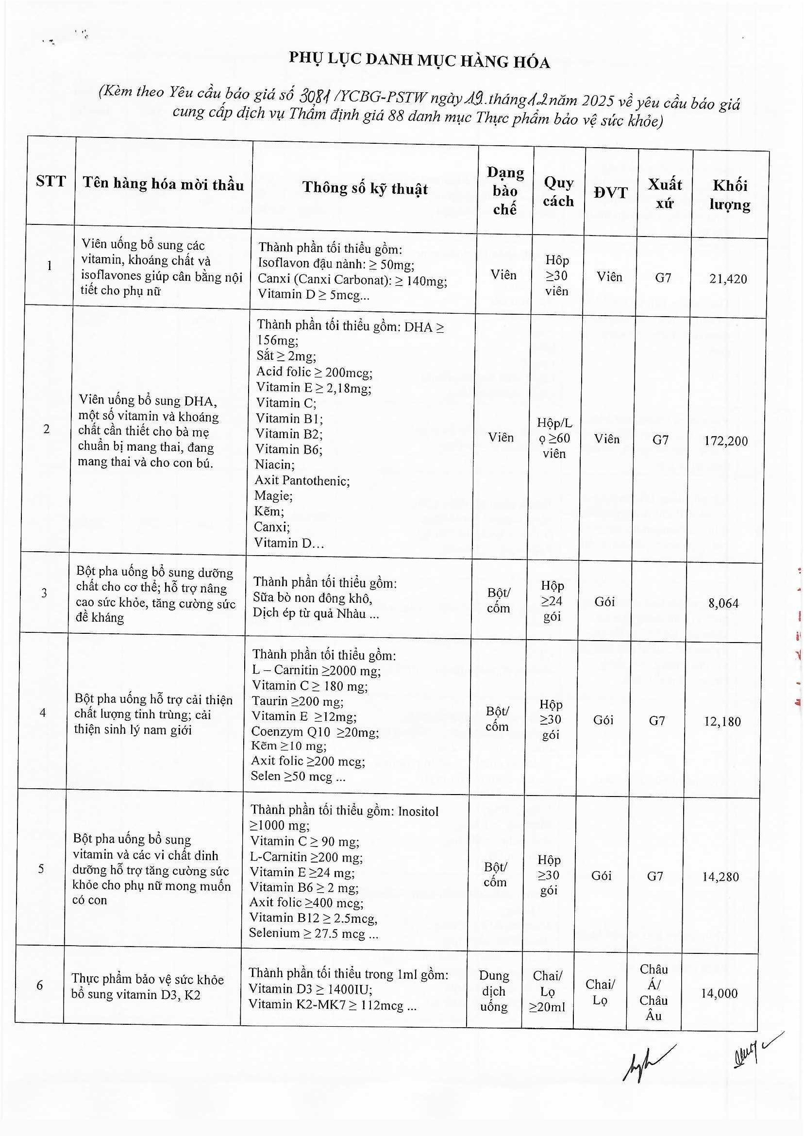 Yêu cầu báo giá số 3081/YCBG-PSTW ngày 19/12/2025