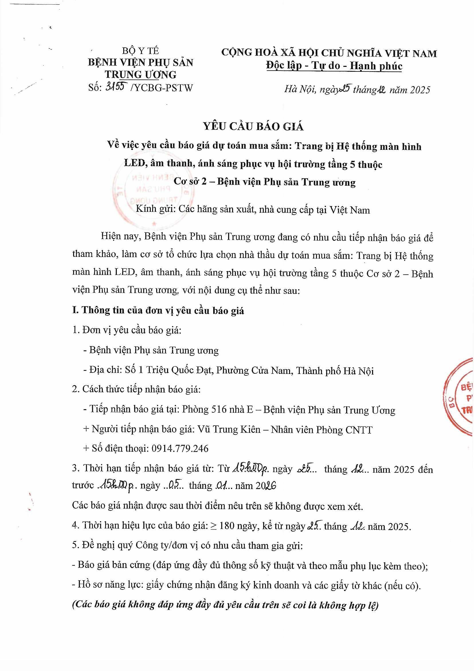 Yêu cầu báo giá số 3155/YCBG-PSTW ngày 25/12/2025