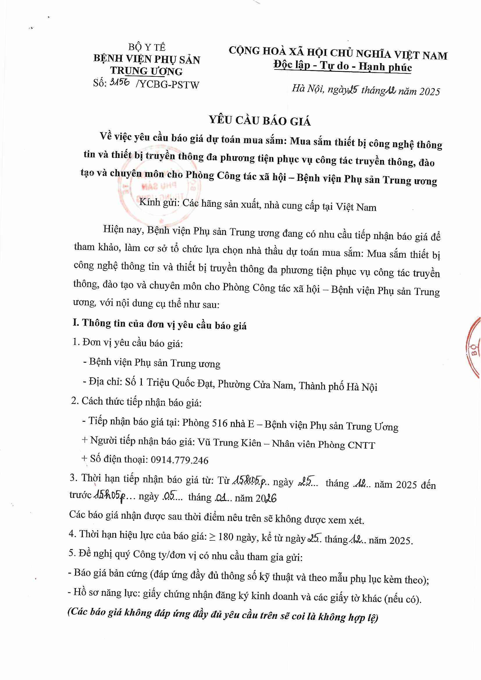 Yêu cầu báo giá số 3136/YCBG-PSTW ngày 25/12/2025