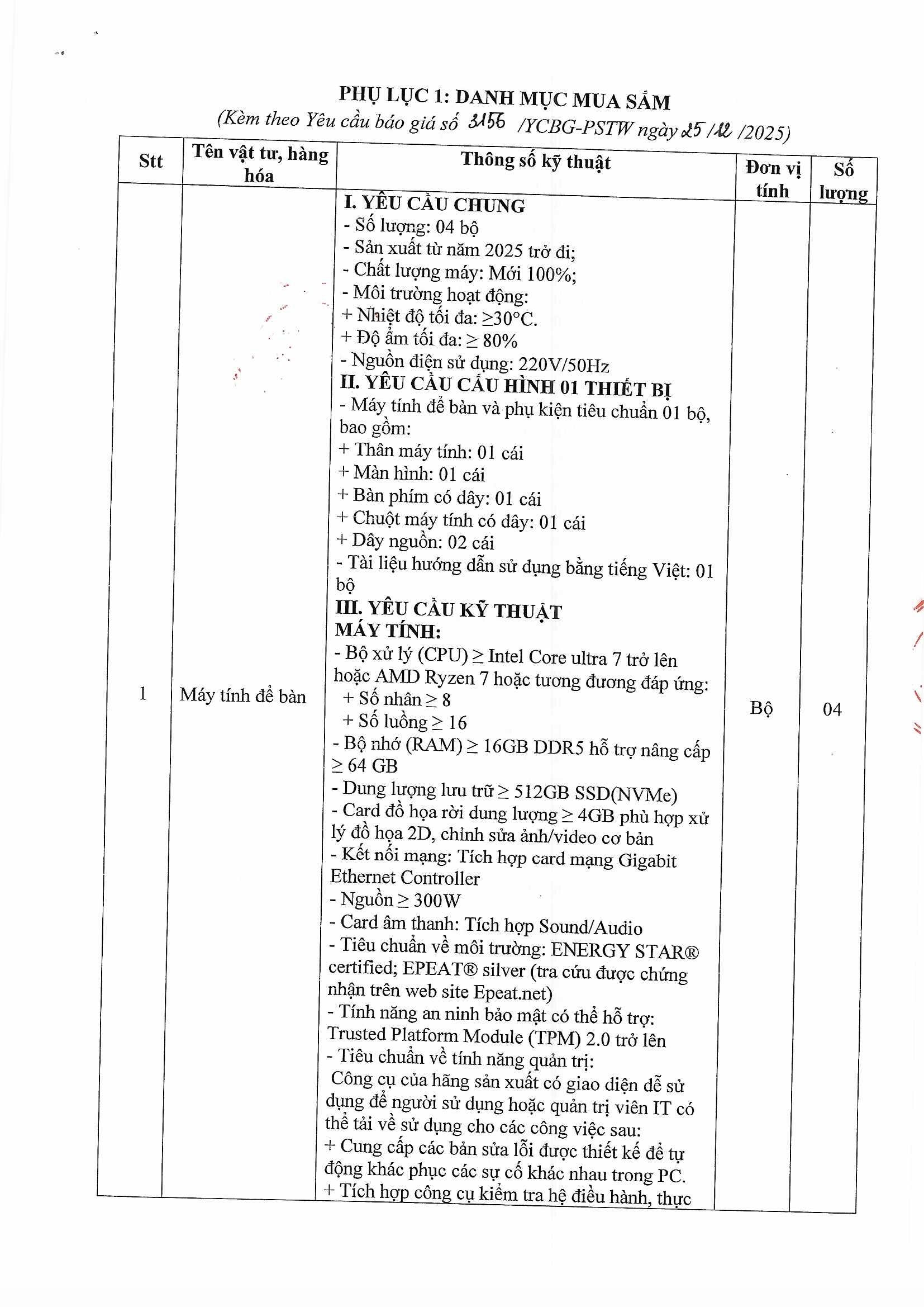 Yêu cầu báo giá số 3104/YCBG-PSTW ngày 23/12/2025