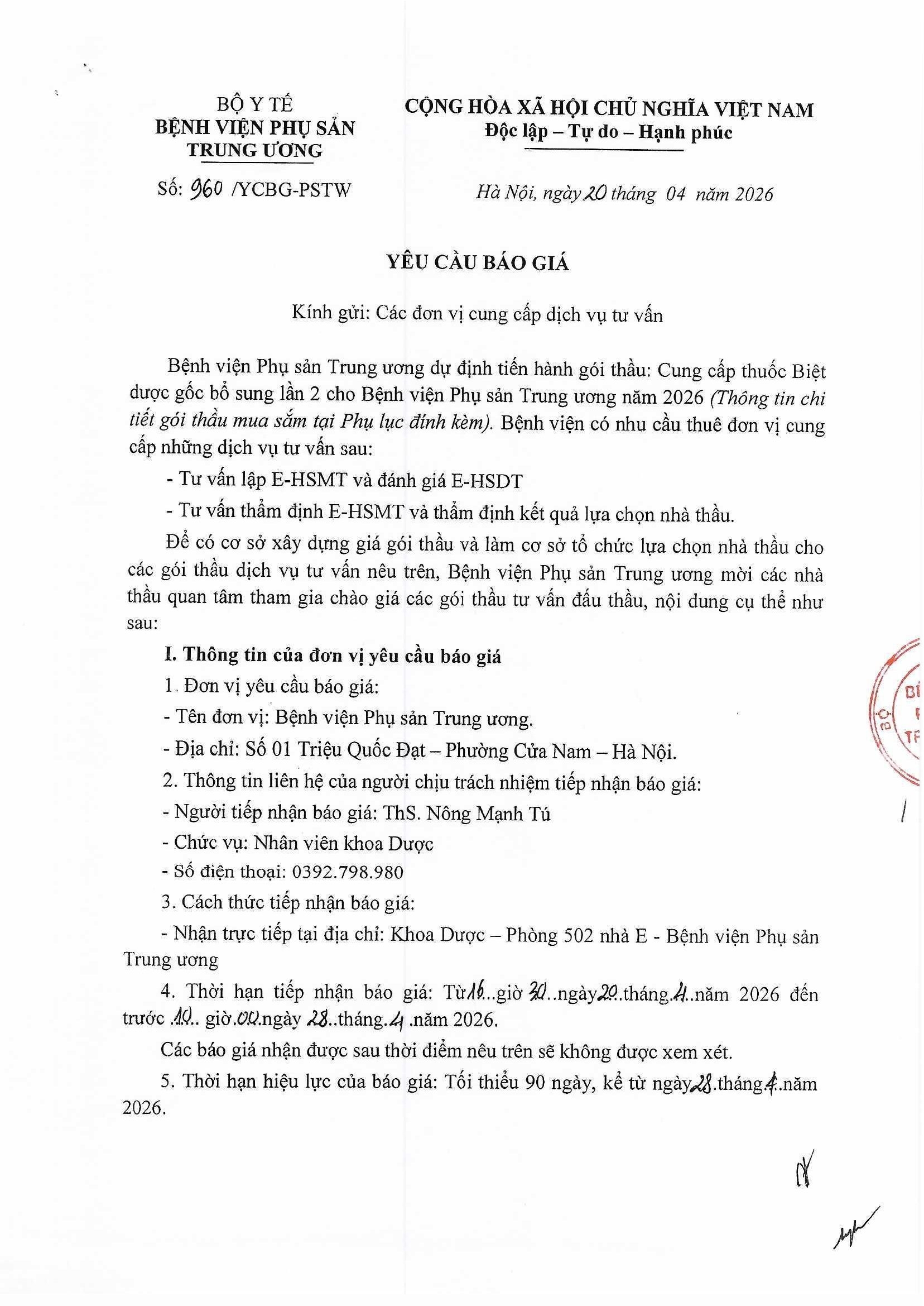 Yêu cầu báo giá số 960/YCBG-PSTW ngày 20/04/2026