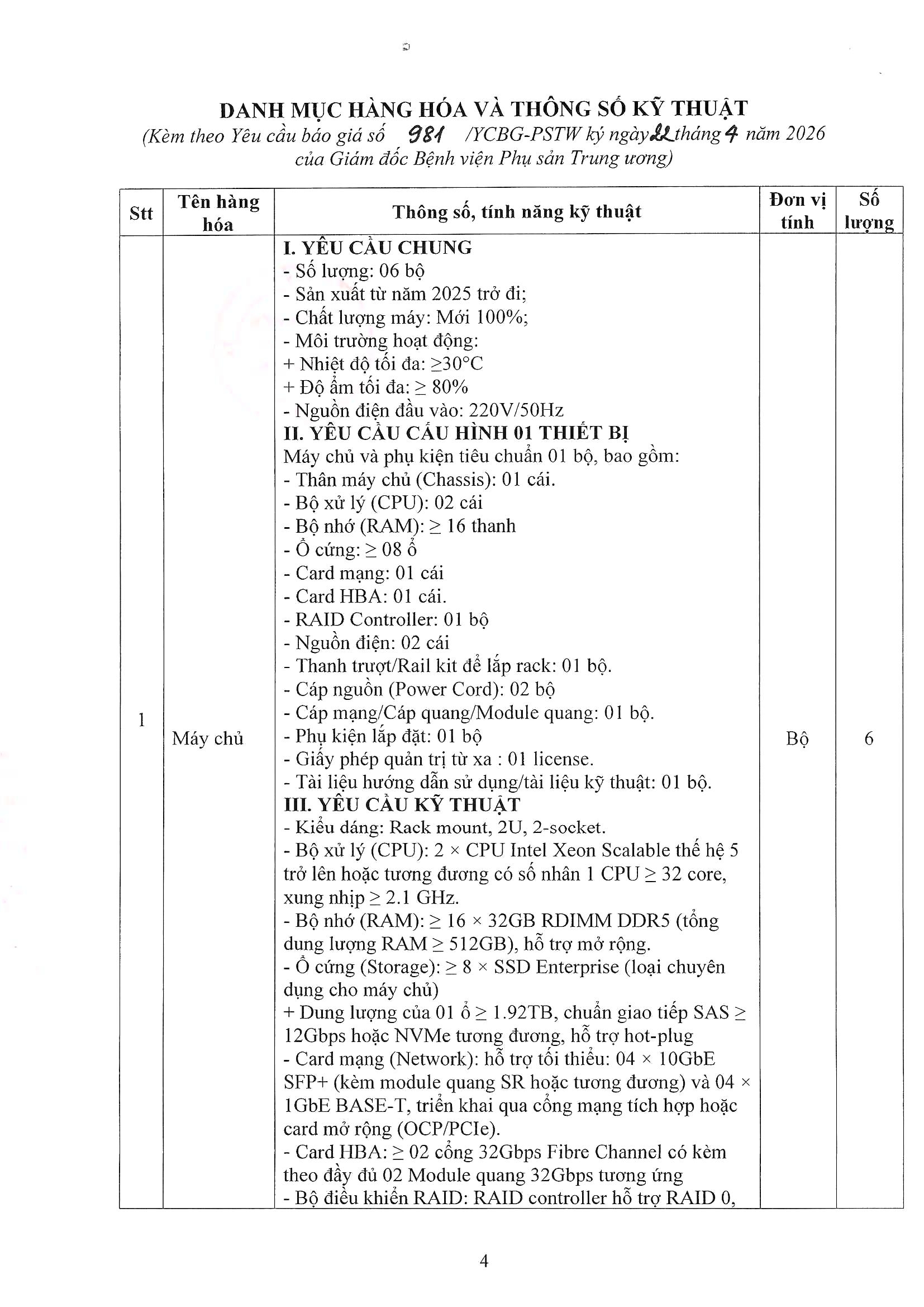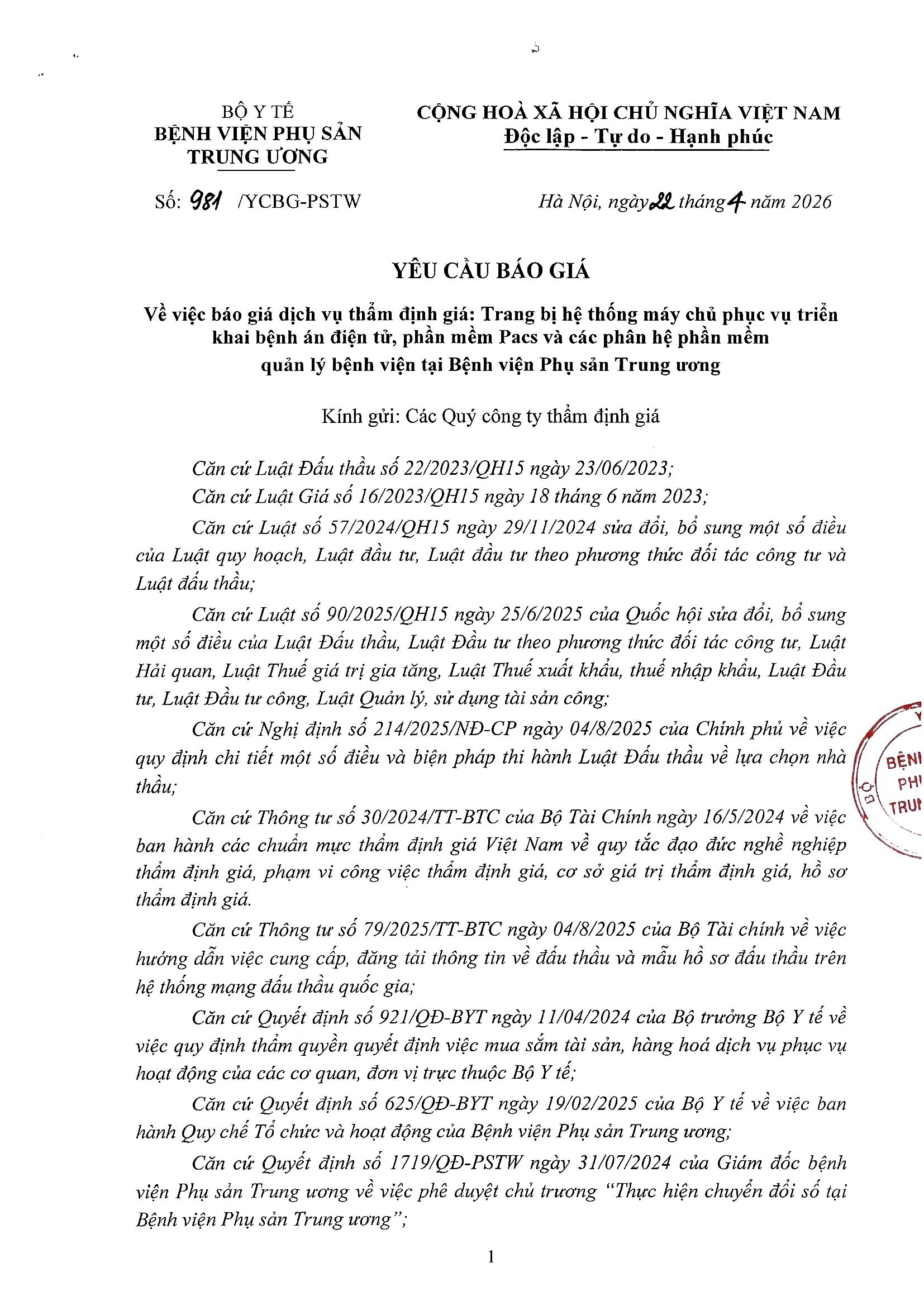 Yêu cầu báo giá số 981/YCBG-PSTW ngày 22/04/2026
