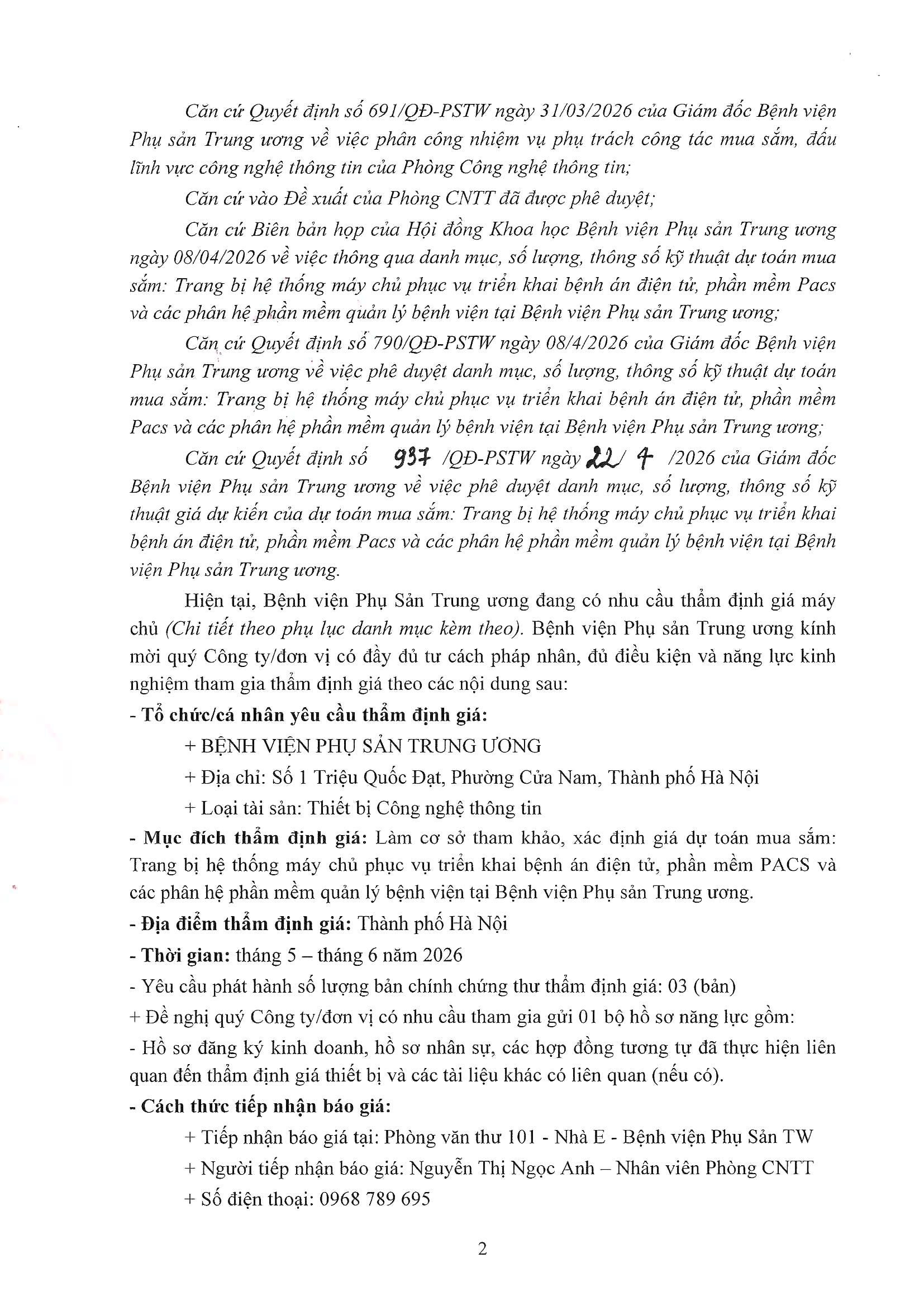 Yêu cầu báo giá số 962/YCBG-PSTW ngày 20/04/2026