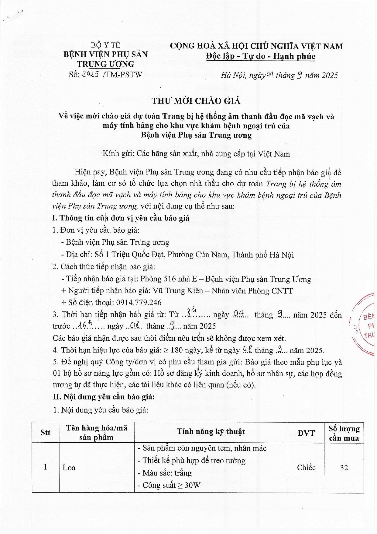 Thư mời chào giá số 2025/YCBG-PSTW ngày 04/09/2025