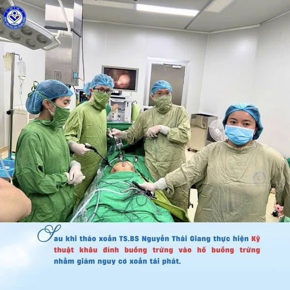Trực tiếp phẫu thuật cho bệnh nhân, TS.BS Nguyễn Thái Giang – Phó Trưởng khoa Phụ Ung thư cho biết, đây là trường hợp xoắn buồng trứng tái phát ở bệnh nhân trẻ, không có u buồng trứng, nguy cơ tái phát tiếp tục là rất lớn. Sau khi tháo xoắn, ê-kíp phẫu thuật đã khâu đính buồng trứng vào hố buồng trứng (oophoropexy) nhằm giảm nguy cơ xoắn tái phát. Đây là kỹ thuật hiếm và khó thực hiện, bởi buồng trứng nằm gần các cấu trúc quan trọng như mạch máu và niệu quản, nếu thao tác không cẩn trọng có thể gây tổn thương.