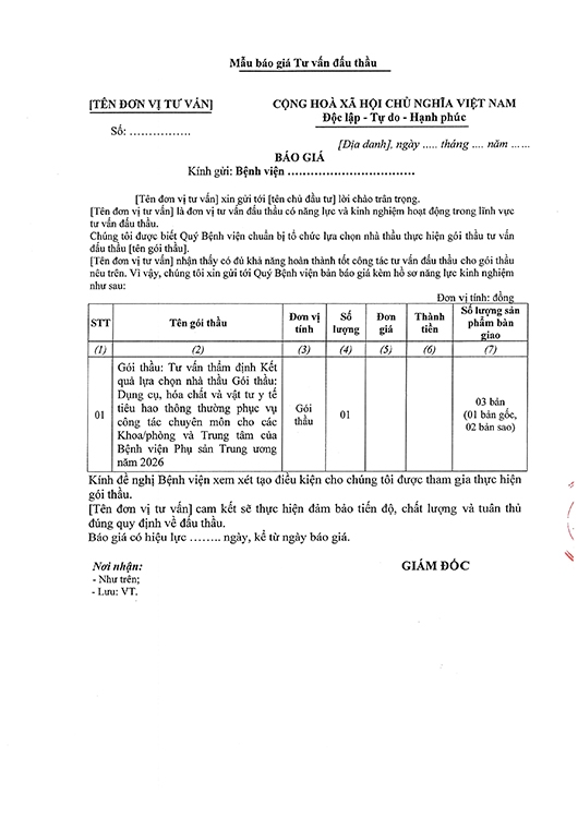Kính gửi: Các đơn vị cung cấp dịch vụ tư vấn đấu thầu
