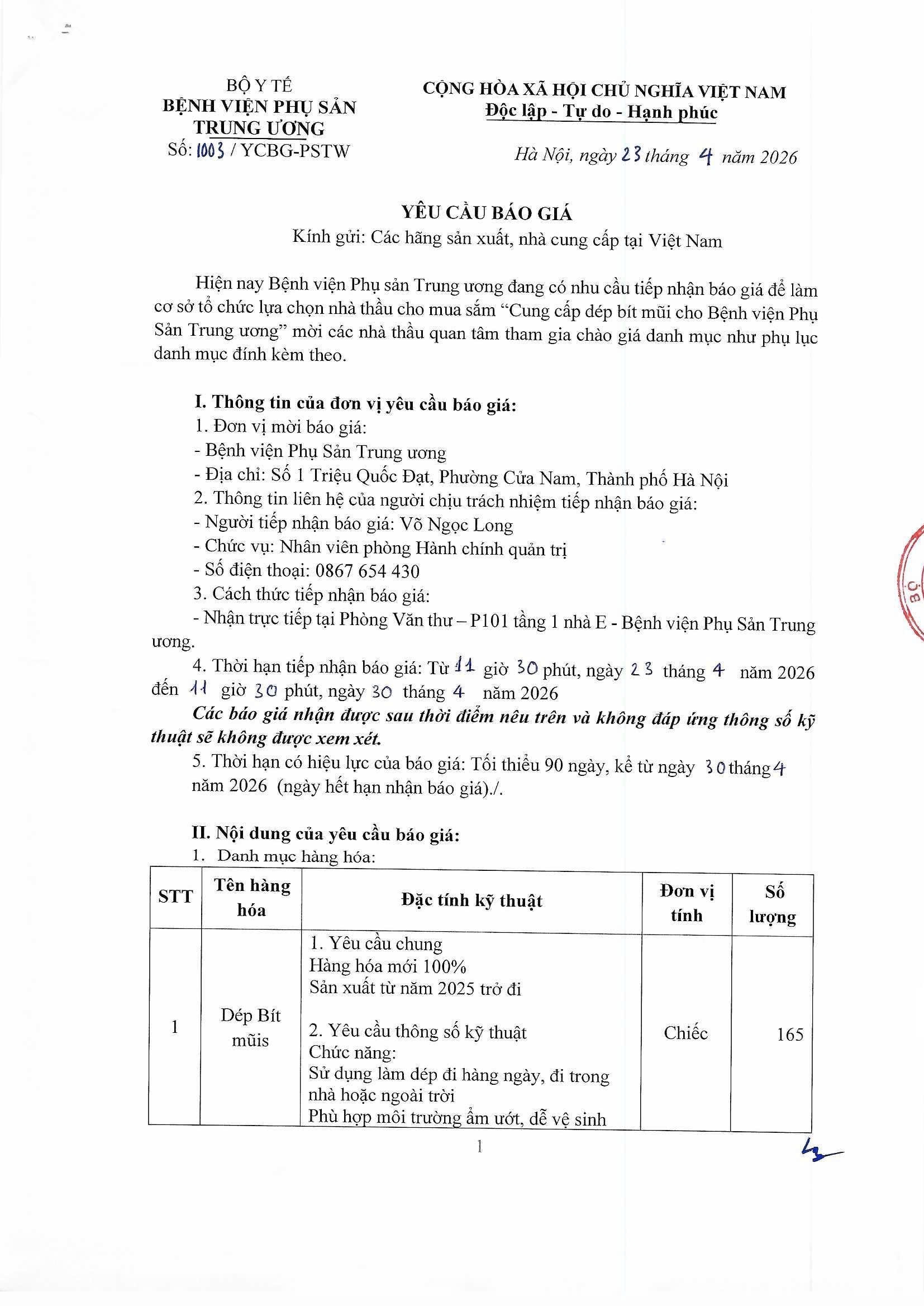 Yêu cầu báo giá số 1003/YCBG-PSTW ngày 23/04/2026