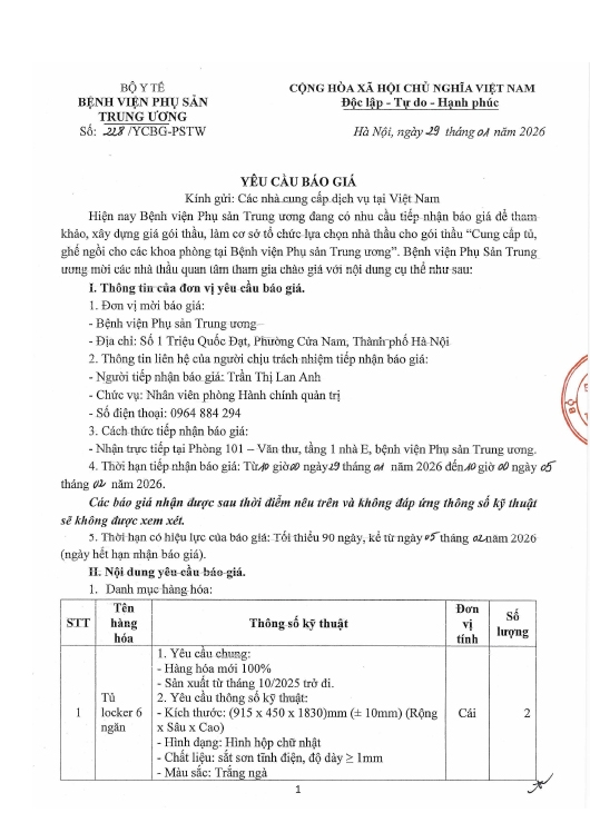 Yêu cầu báo giá số 228/YCBG-PSTW ngày 29/01/2026