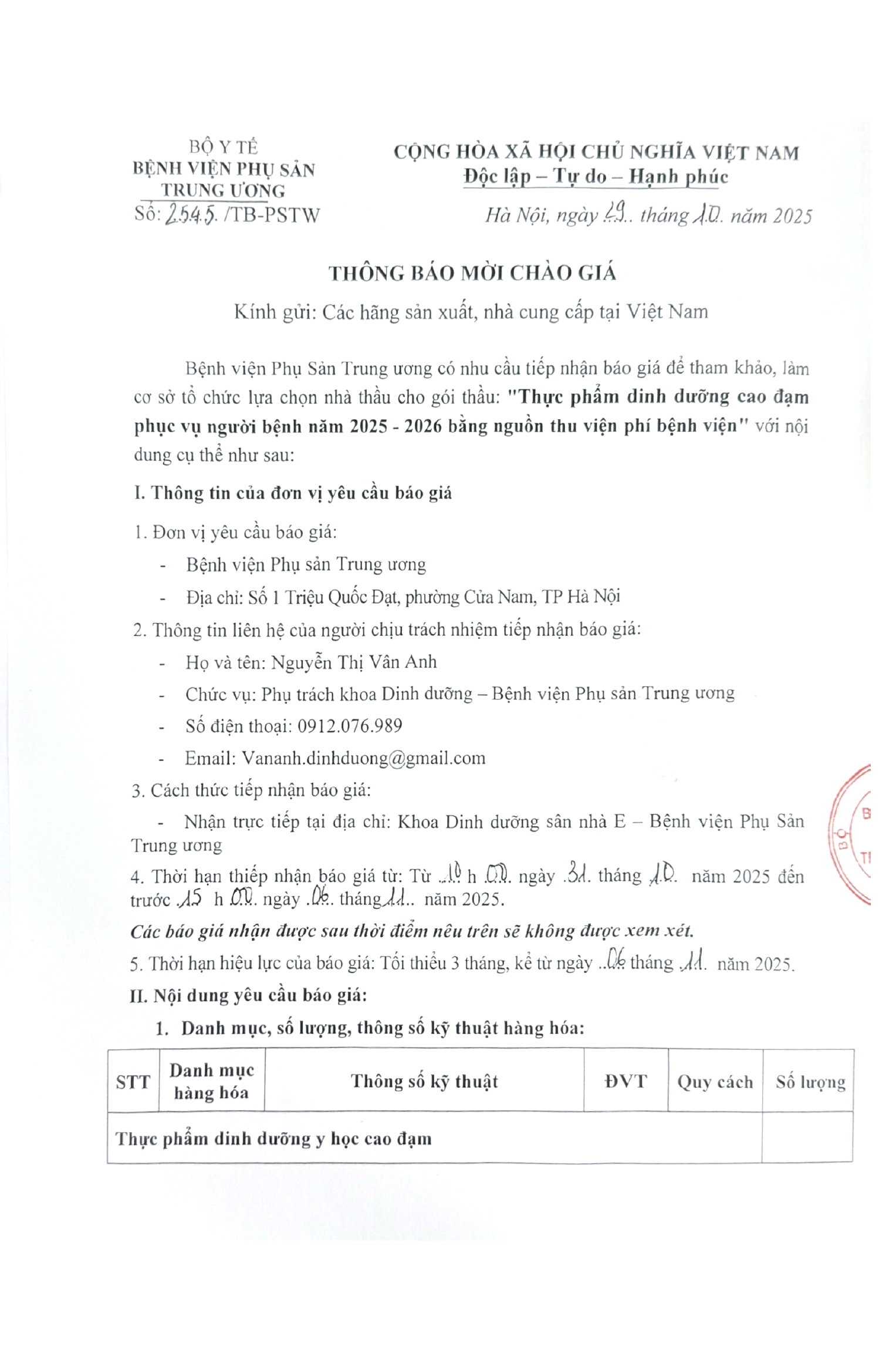 Yêu cầu báo giá số 2545/YCBG-PSTW ngày 31/10/2025