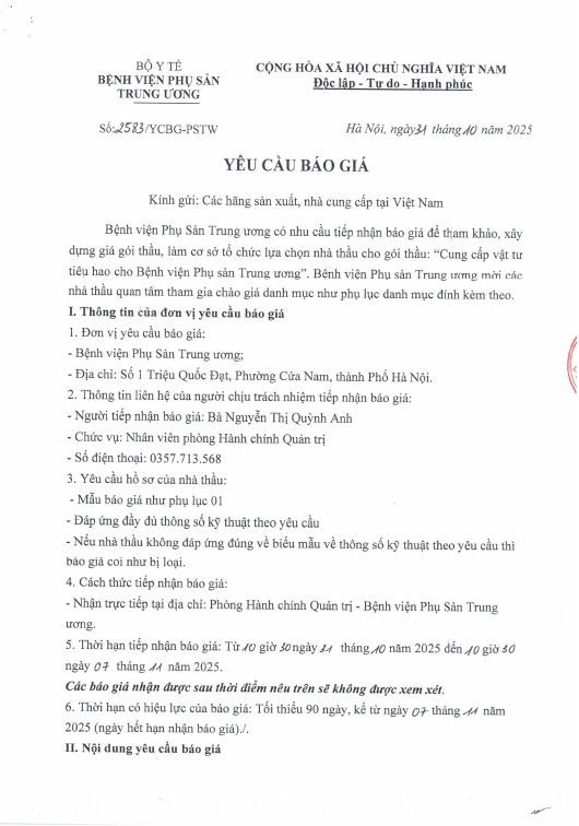 Yêu cầu báo giá số 2583/YCBG-PSTW ngày 31/10/2025