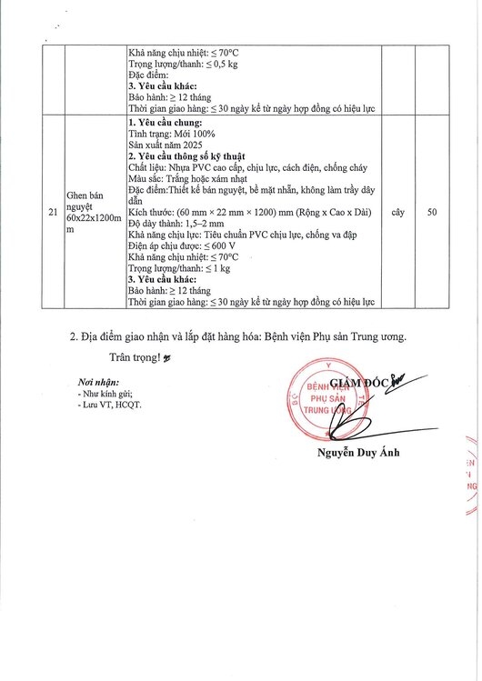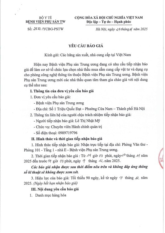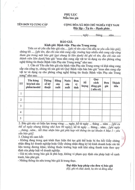 Kính gửi: Các nhà cung cấp dịch vụ Bốc xếp, thu gom, vận chuyển và xử lý đồ vải đã qua sử dụng tại Bệnh viện Phụ sản Trung ương tại Việt Nam