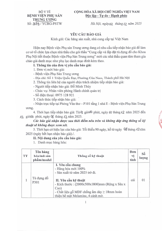 Yêu cầu báo giá số 2879/YCBG-PSTW ngày 02/12/2025