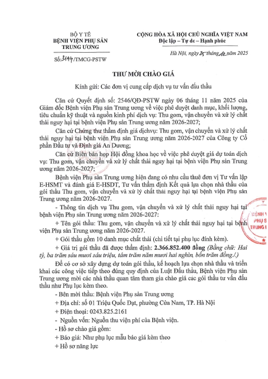 Kính gửi: Các đơn vị cung cấp dịch vụ tư vấn đấu thầu