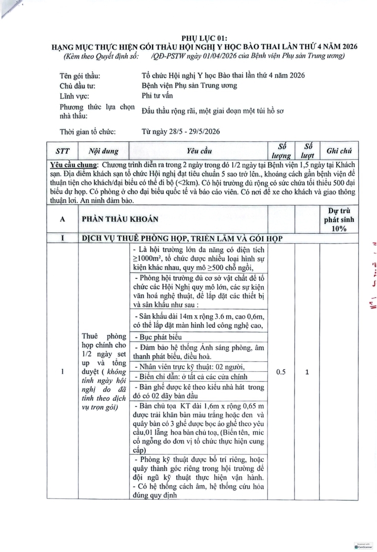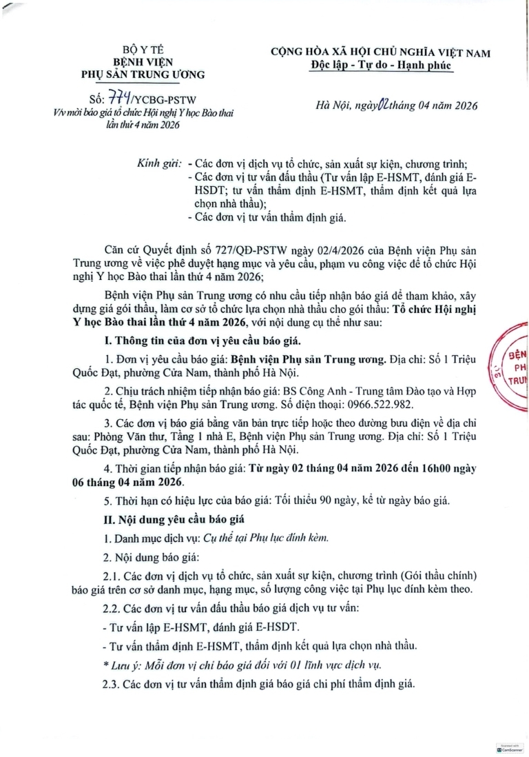 Về việc mời báo giá tổ chức Hội nghị Y học Bào thai lần thứ 4 năm 2026