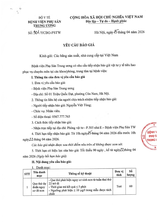 Yêu cầu báo giá số 901/YCBG-PSTW ngày 15/04/2026
