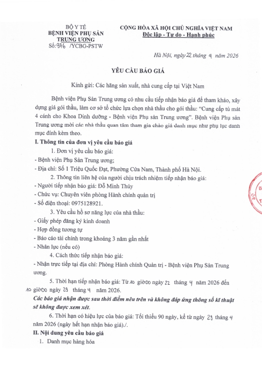 Yêu cầu báo giá số 976/YCBG-PSTW ngày 22/04/2026