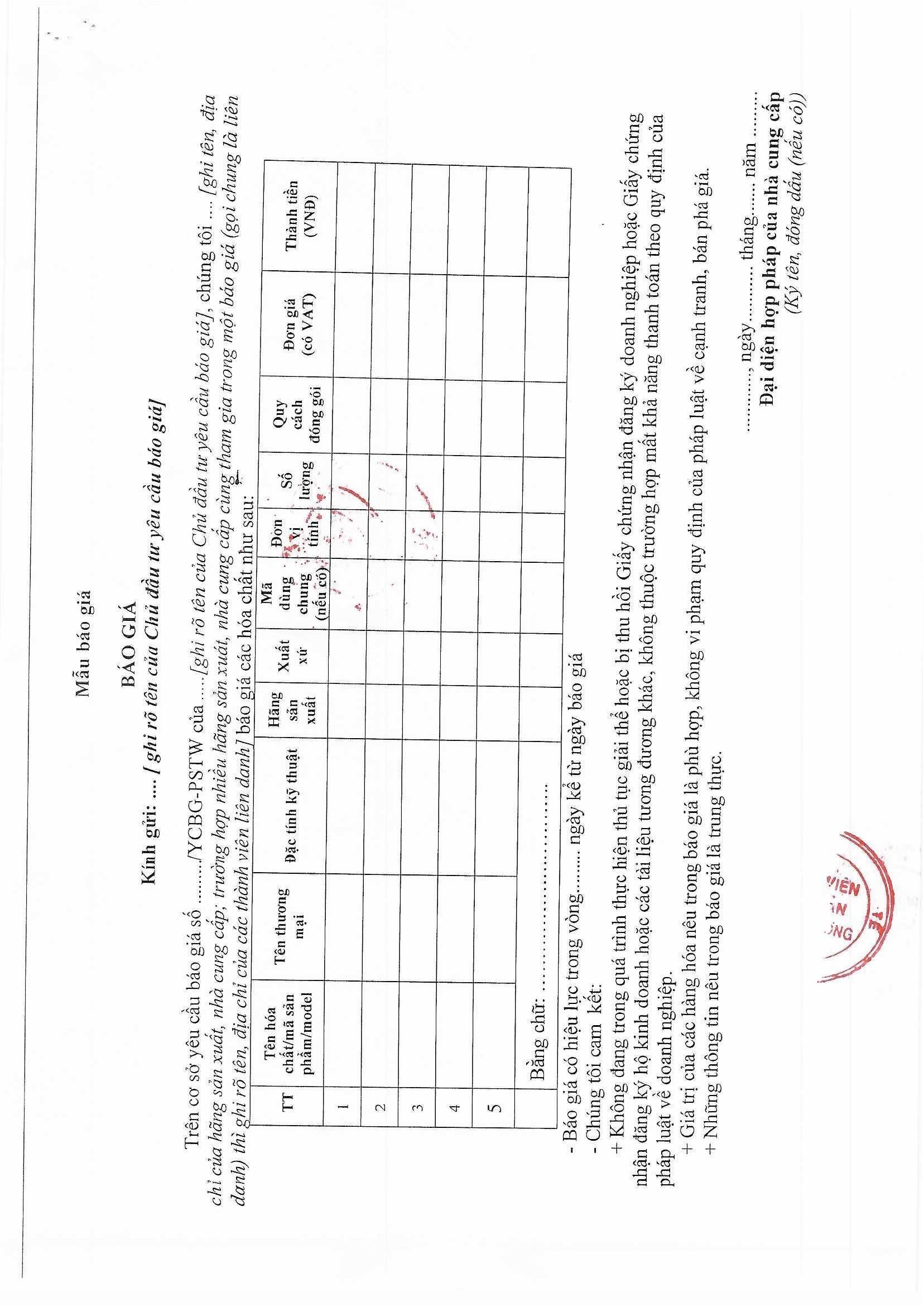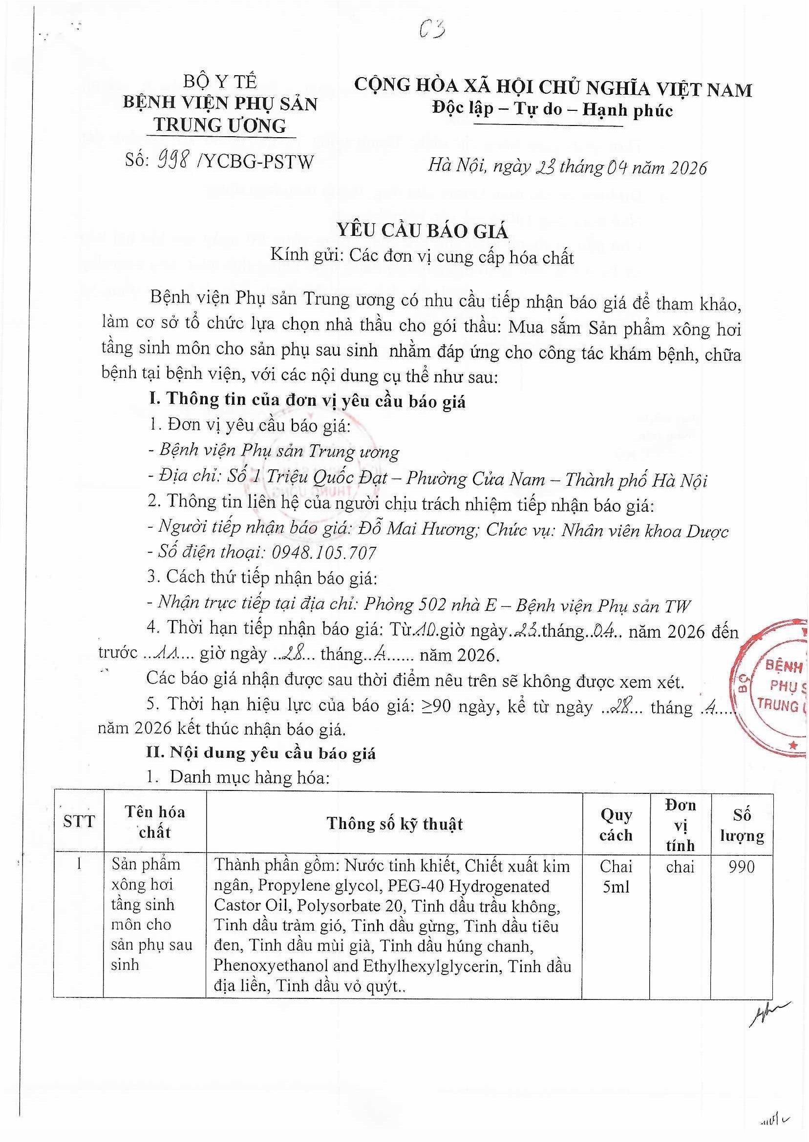 Yêu cầu báo giá số 998/YCBG-PSTW ngày 23/04/2026